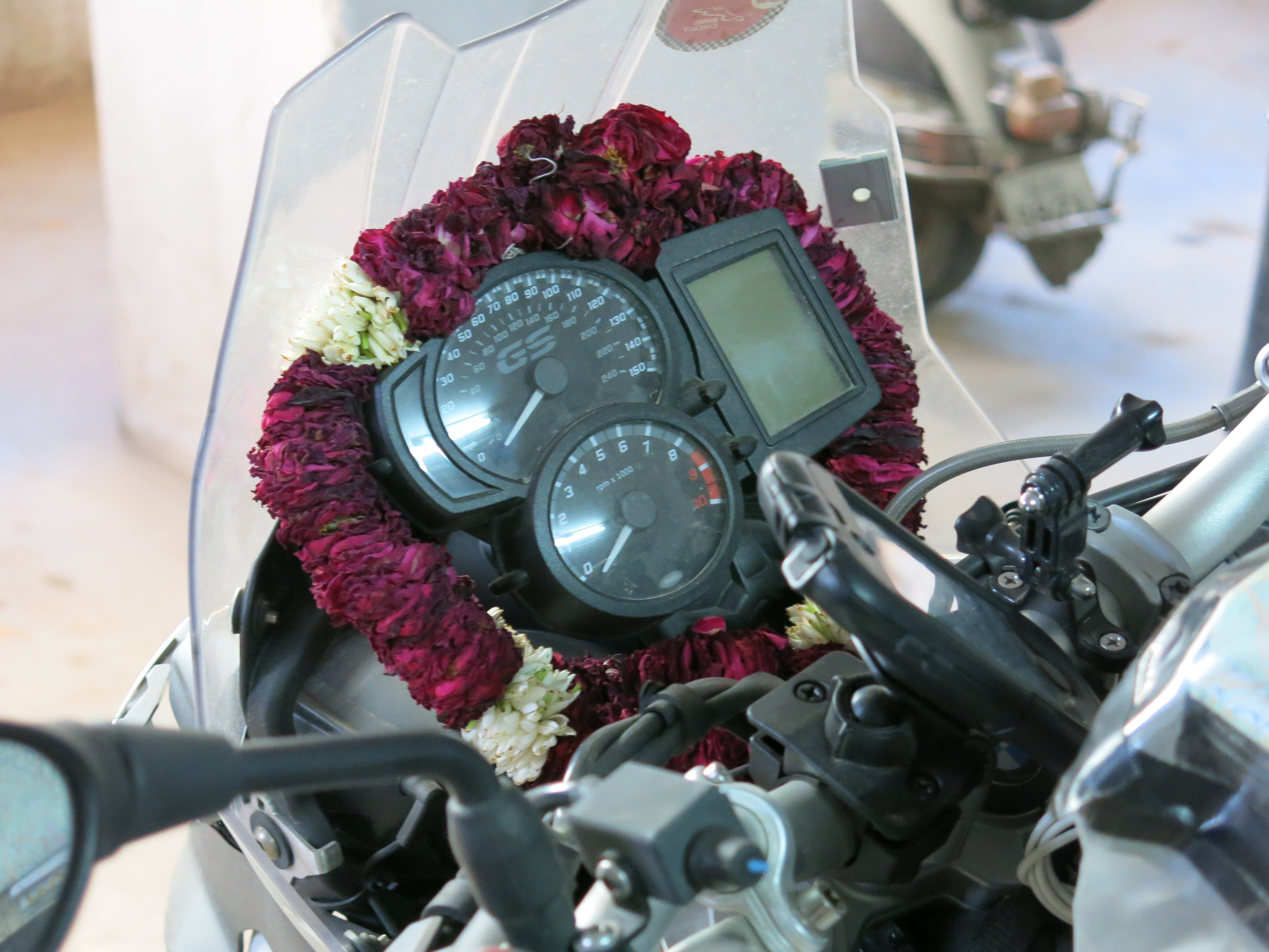 The flower garland he gave me found a home on the motorcycle…