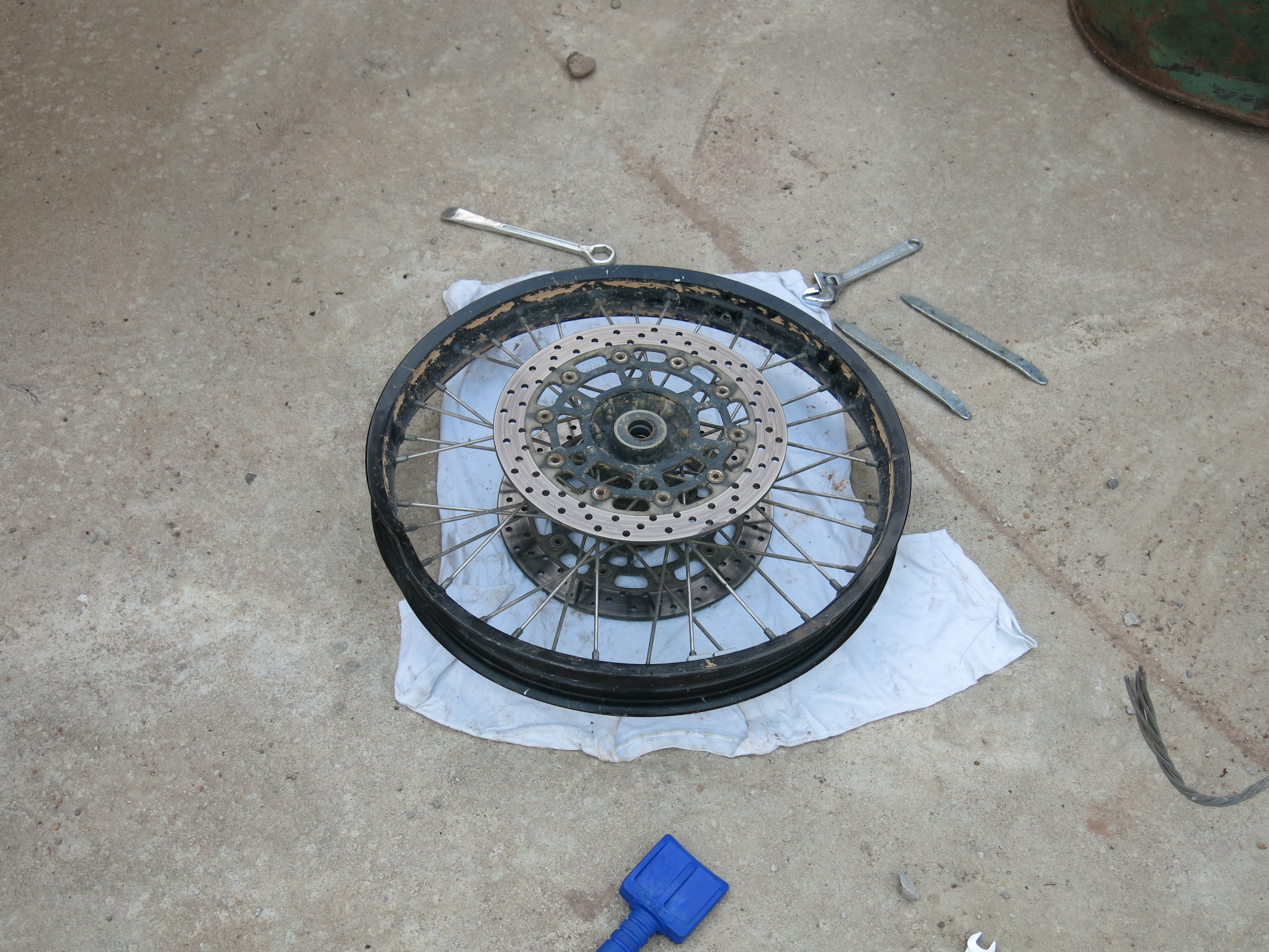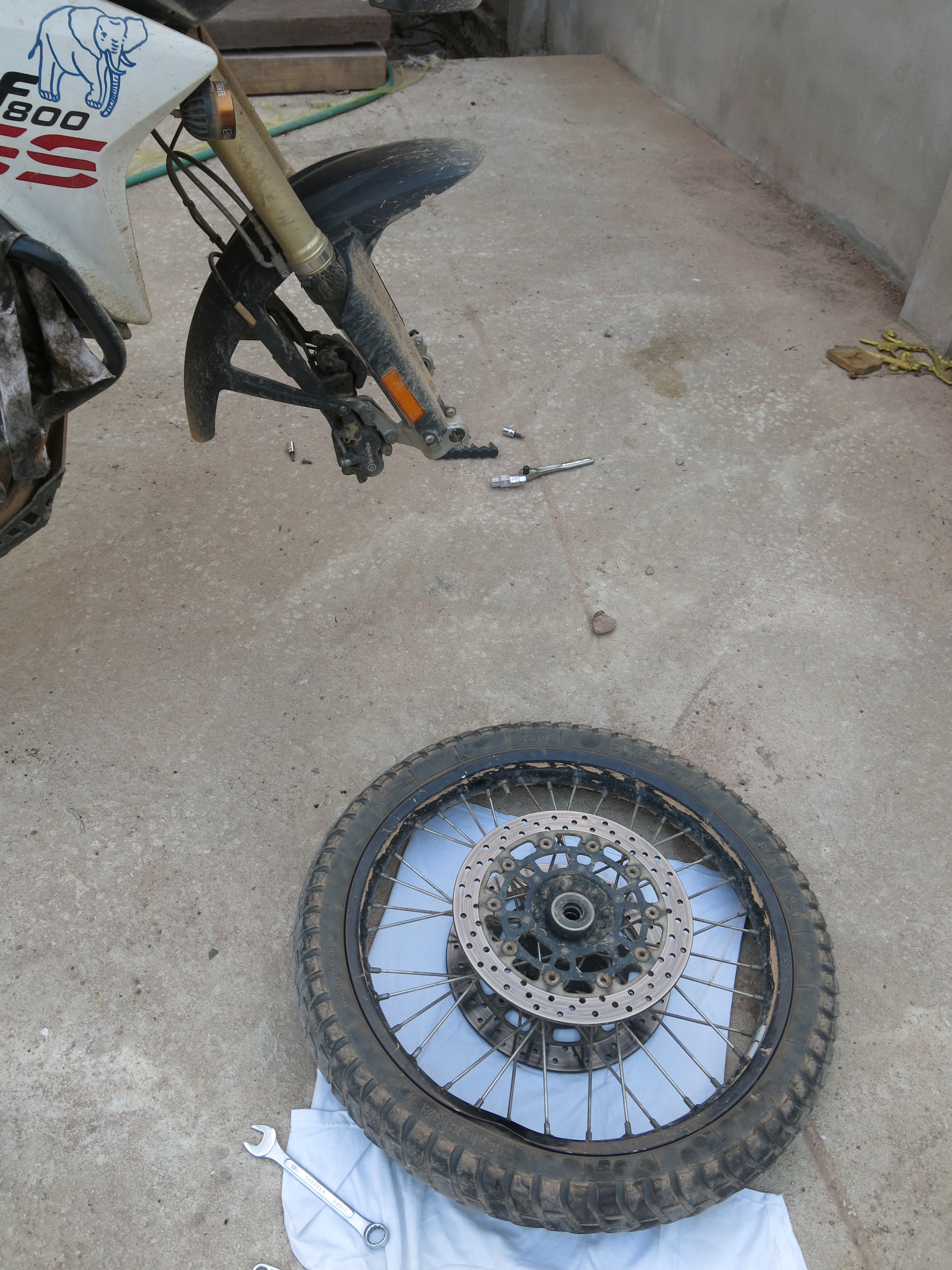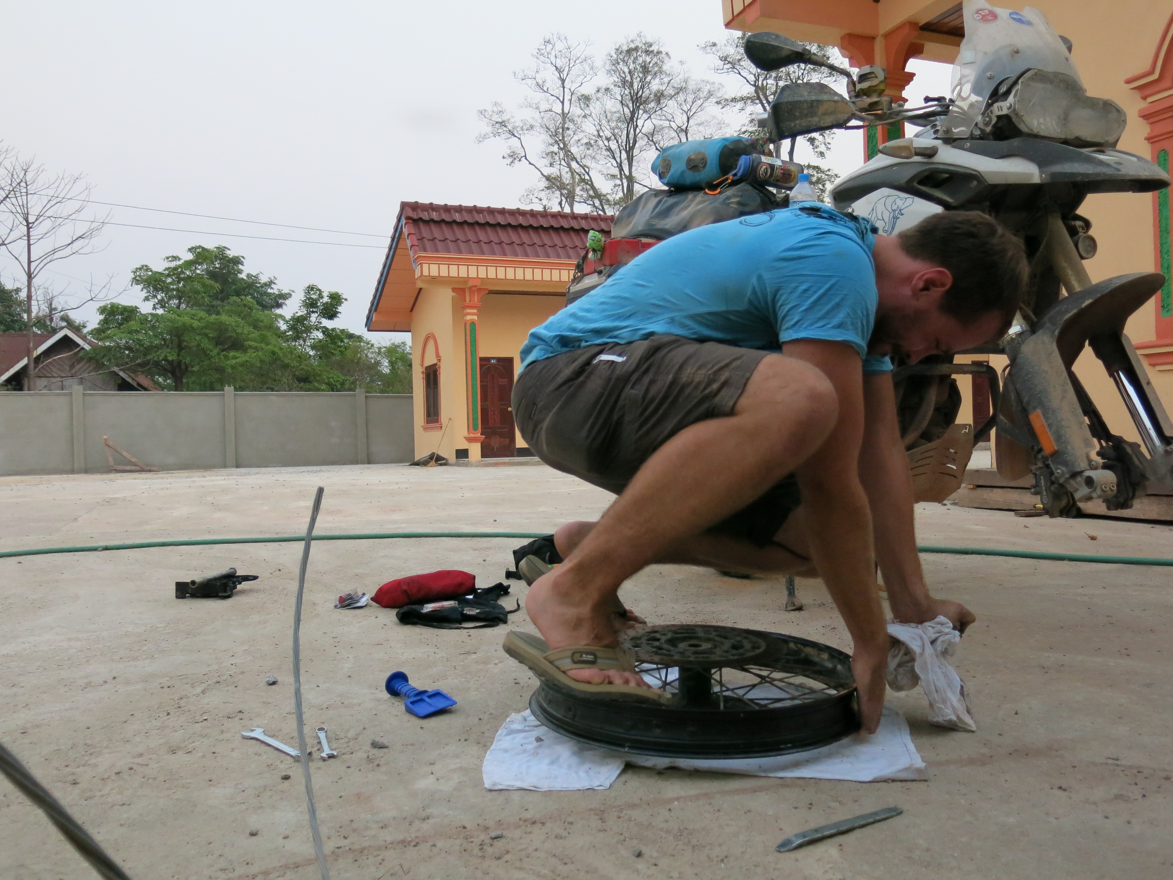 When I arrived in Ban Nahin and got settled in, I decided it was time to try and get my bent front tire back into a little better shape.