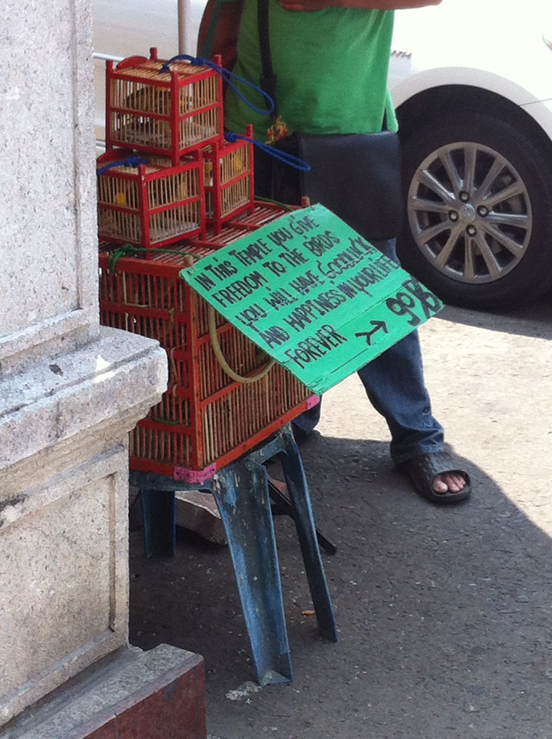 Next to the Standing Buddha, there was a guy selling caged birds. The purpose is to buy them, then set them free and “you will have good luck and happiness in your life forever.” This guy really must be taking on a lot of bad luck and unhappiness by continually trapping these birds.