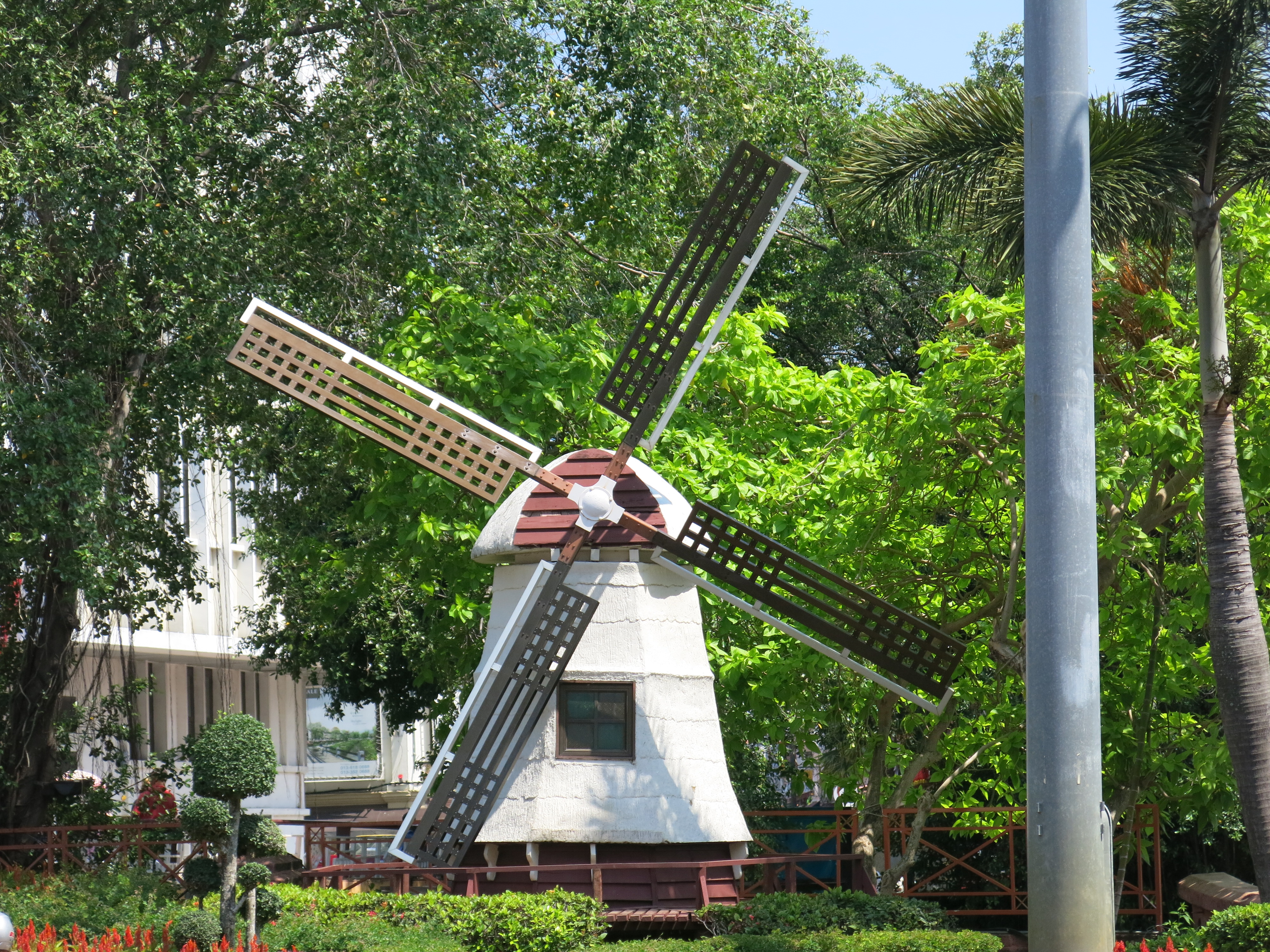 A replica of a 13m diameter waterwheel built by the Melaka Sultanate during Malay rule.