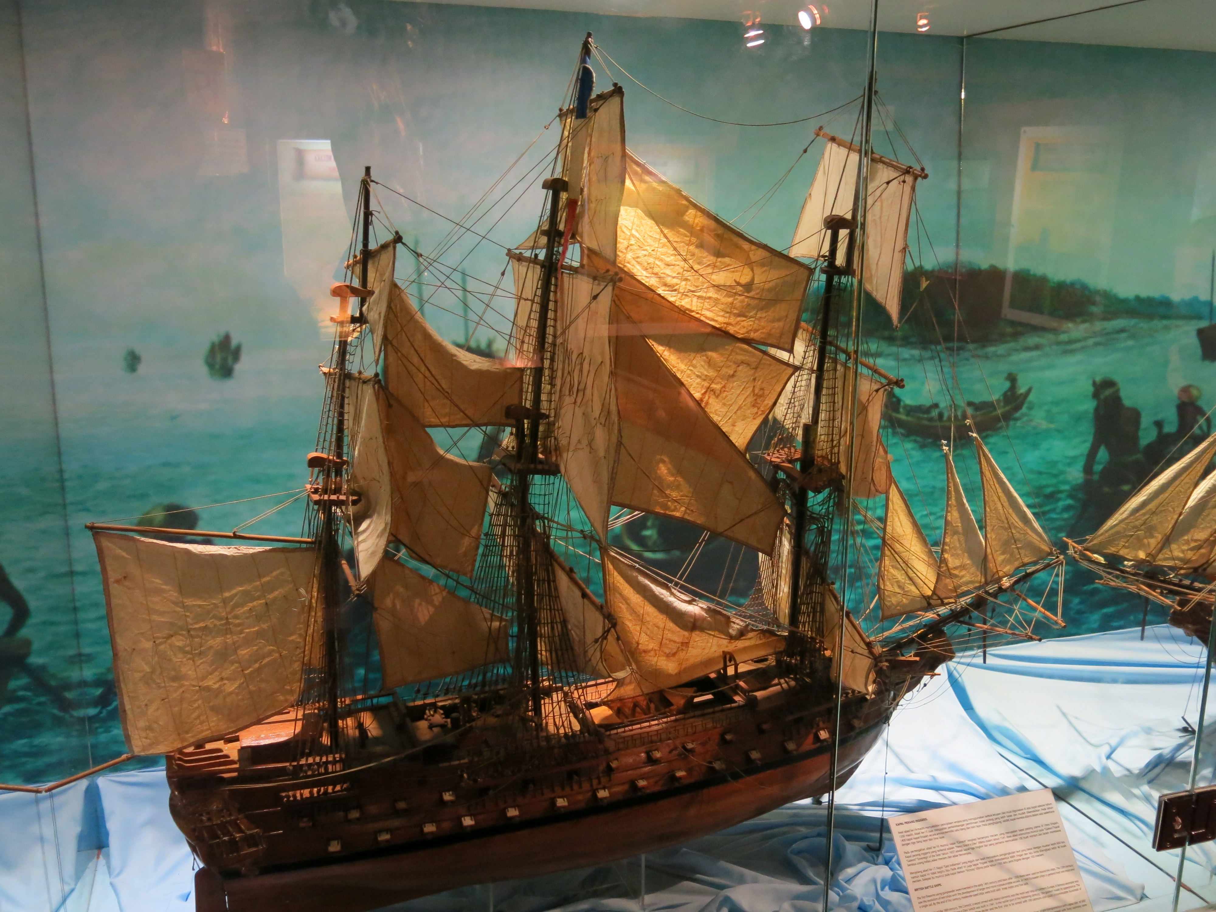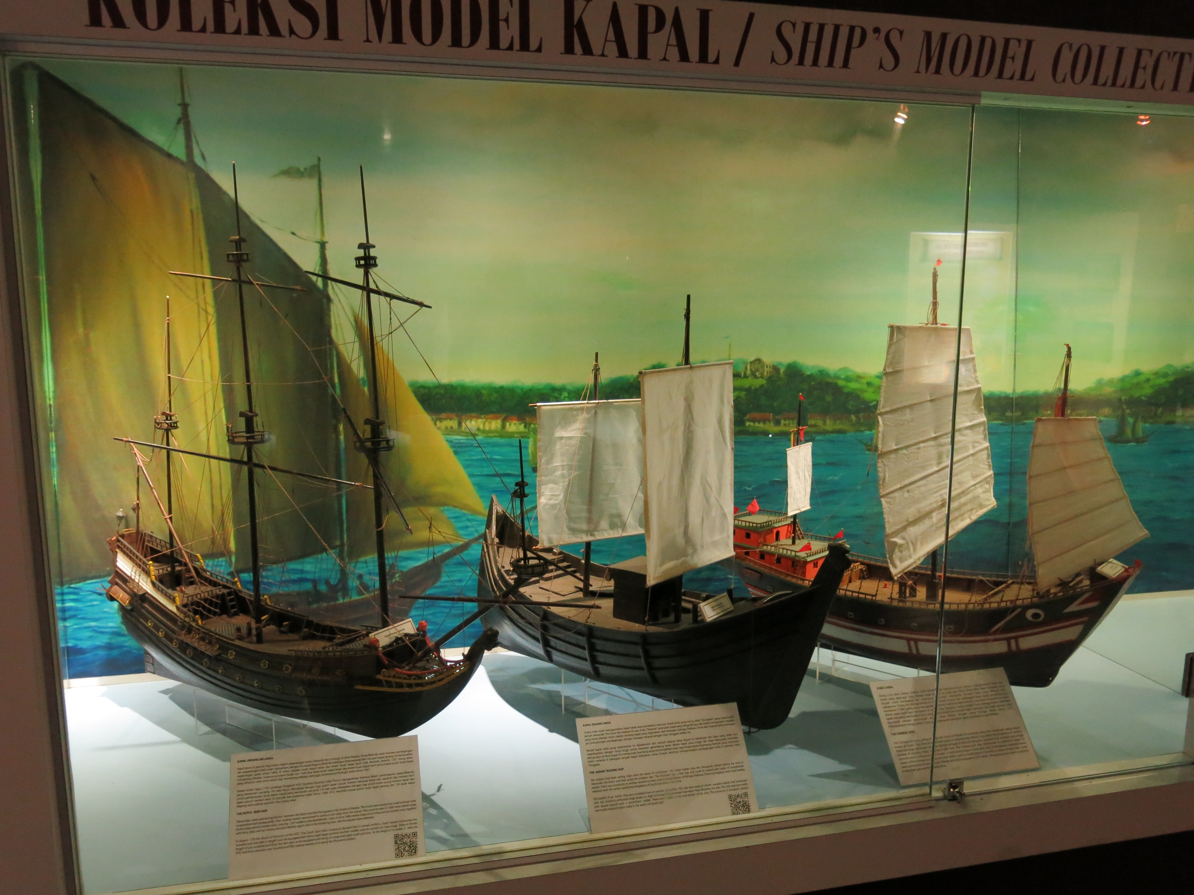 Models of a Dutch warship, Indian trading ship, and a Chinese Junk