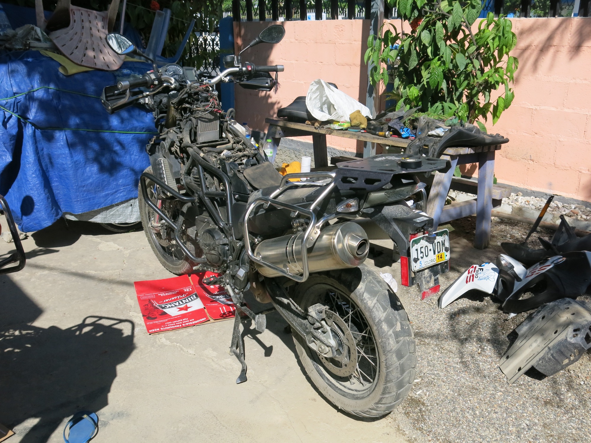 Australian customs is pretty tight with what they’ll allow in the country. For any vehicle to enter, it’s got to be incredibly clean…like new is their request. Unfortunately, getting my bike to look like new is impossible at this point, but I at least made a bit of an attempt, using untold amounts of soap, water, degreaser, and gasoline, and going through a few old tshirts and a Costco-like pack of various brushes.